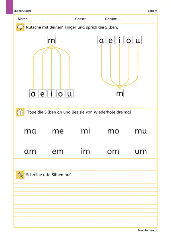 Die Arbeitsblätter sind bewusst kurz und klar aufgebaut: Finger rutschen lassen, die Silbe laut sprechen, mehrmals wiederholen und (je nach Blatt) aufschreiben. Die Vorlagen kannst du immer wieder neu beschriften und für weitere Buchstaben nutzen.