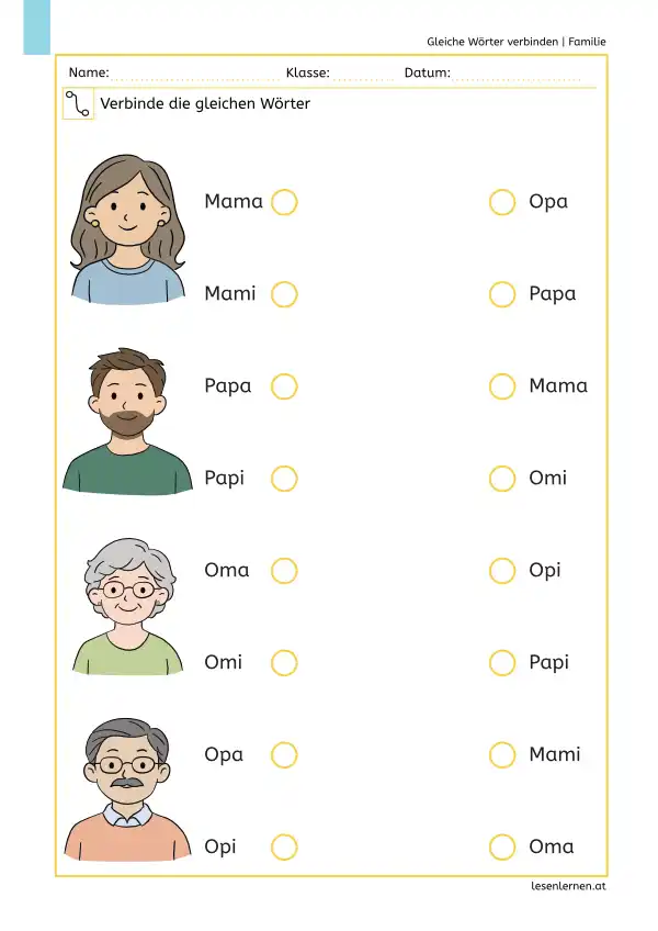 Arbeitsblatt zum Thema Familie: Gleiche Wörter wie Mama, Papa, Oma und Opa verbinden