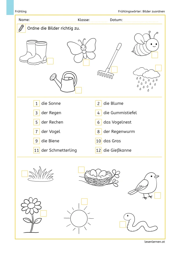 Frühling, Garten, Wiese, Blume, Blüte, Knospe, Blatt, Zweig, Baum, Samen, Erde, Pollen, Regen, Pfütze, Wolke, Wind, Sonne, Regenbogen, Nest, Ei, Vogel, Amsel, Spatz, Biene, Schmetterling, Marienkäfer, Hummel, Regenwurm, Schnecke, Frosch, Hase, Lamm, Küken, Krokus, Tulpe, Narzisse, Schneeglöckchen, April, März, Mai, Ostern, Gießkanne, Regenschirm, Gummistiefel