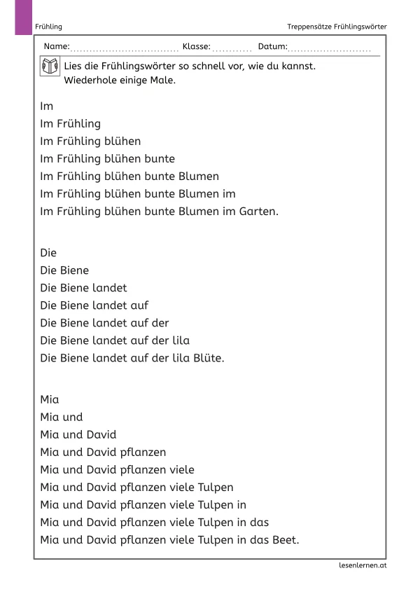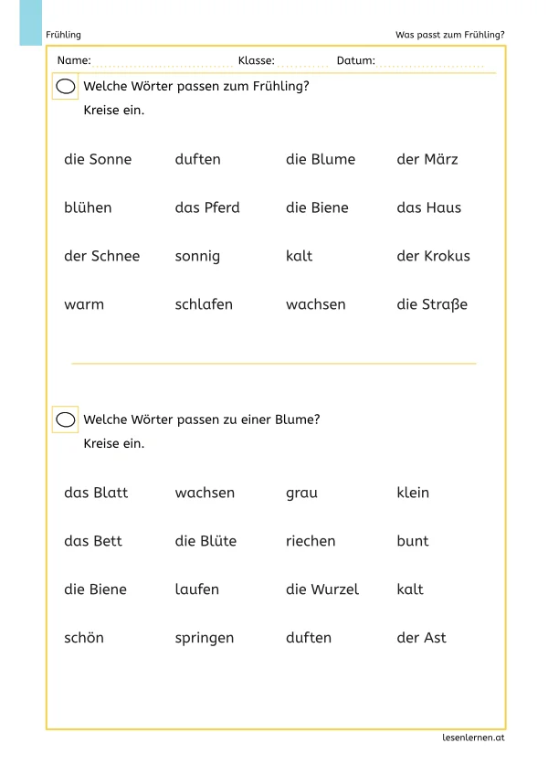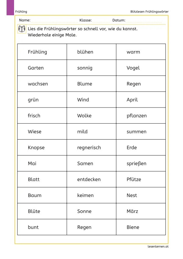 blühen, wachsen, pflanzen, säen, gießen, graben, duften, riechen, summen, zwitschern, entdecken, beobachten, spielen, spazieren