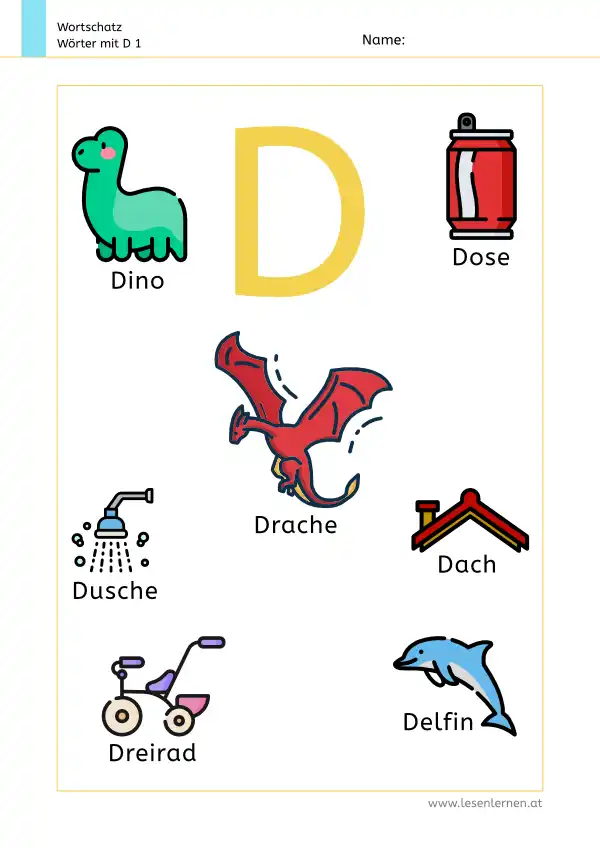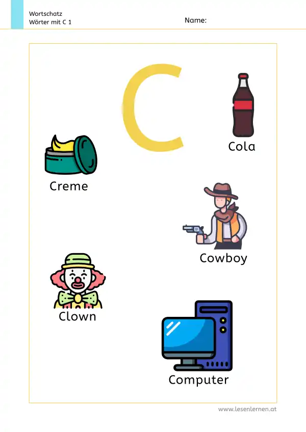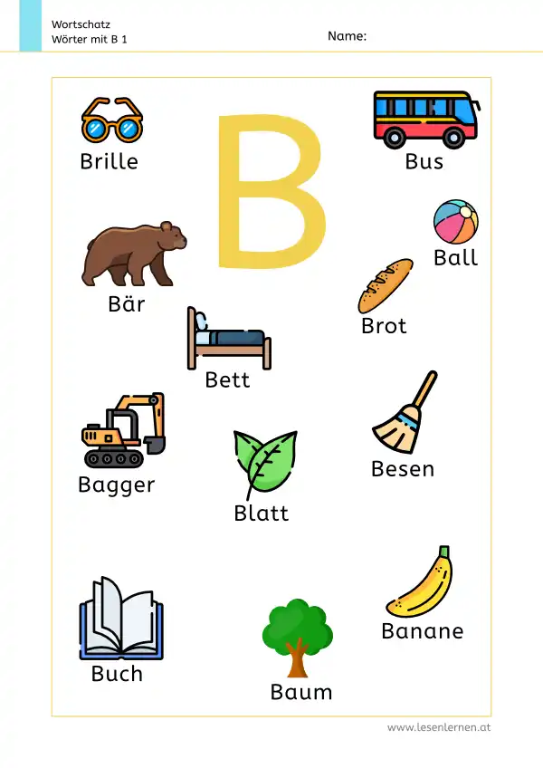 Diese Arbeitsblätter helfen Kindern dabei, Wörter zu einzelnen Buchstaben zu entdecken. Zu jedem Buchstaben werden passende Bilder gezeigt, die mit dem entsprechenden Laut beginnen.